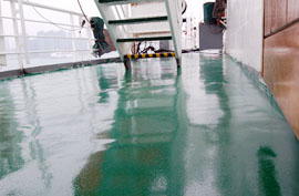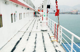 接到該訂單后,公司派一支素質(zhì)過硬的施工隊(duì)伍奔赴香港開始作業(yè),由于期間香港天氣變化反復(fù),時(shí)常下雨;待基面底漆頑固,銹跡斑斑難以清理,均為凹凸不平的麻面;再加上該郵輪白天需正常營業(yè),施工多只能在晚上進(jìn)行,等等一系列因素都給施工帶來了嚴(yán)峻考驗(yàn)。青龍公司歷來重視每一筆訂,注重每一個(gè)細(xì)節(jié),董事長宋敦清先生得知后,親自前往,與公司總工徐新生論證了一個(gè)最佳方案后開始指導(dǎo)施工,考慮到施工部位特殊,長期在海面上風(fēng)吹日曬,最后選用了其耐候、耐酸堿、耐紫外線、耐老化、耐霉菌、耐鹽霧、耐臭氧、耐溶劑、耐磨、耐沖擊和耐油性等綜合性能優(yōu)異的CQ101防水密封涂料。先用特殊纖維填充10mm高度,再在上面找平3mm厚,然后用青龍CQ101防水密封涂料自流平成膜。經(jīng)過一個(gè)星期的艱苦奮戰(zhàn),順利完成施工。