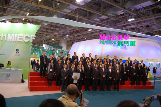 圖為:本屆展會(huì)出席政商代表(前排右三為澳門特首崔世安)在澳門展館前留影