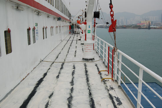 接到該訂單后,3月21日,公司派一支素質(zhì)過硬的施工隊伍奔赴香港開始作業(yè),由于期間香港天氣變化反復,時常下雨;待基面底漆頑固,銹跡斑斑難以清理,均為凹凸不平的麻面;再加上該郵輪白天需正常營業(yè),施工多只能在晚上進行,等等一系列因素都給施工帶來了嚴峻考驗。青龍公司歷來重視每一筆訂,注重每一個細節(jié),董事長宋敦清先生得知后,親自前往,與公司總工徐新生論證了一個較好方案后開始指導施工,考慮到施工部位特殊,長期在海面上風吹日曬,之后選用了其耐候、耐酸堿、耐紫外線、耐老化、耐霉菌、耐鹽霧、耐臭氧、耐溶劑、耐磨、耐沖擊和耐油性等綜合性能優(yōu)異的