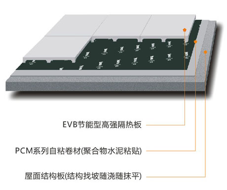 屋面防水保溫隔熱一體化系統(tǒng)的結(jié)構(gòu)層次為結(jié)構(gòu)層——青龍PCM系列自粘防水卷材——EVB節(jié)能型高強(qiáng)隔熱板(如下圖),大大減少傳統(tǒng)防水保溫屋面構(gòu)造層次,減輕了屋面載荷,而且施工十分簡(jiǎn)單,屋面防水維修非常方便,綜合性價(jià)比高,完全滿足屋面熱工指標(biāo)計(jì)算要求,防水、隔熱效果顯著,防火等級(jí)為A級(jí)。