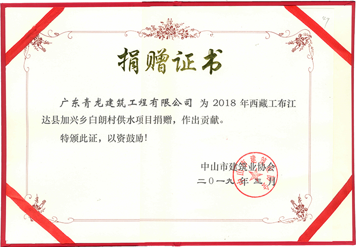 3月28日,在中山市建筑業(yè)協(xié)會第七屆二次會員大會暨工程創(chuàng)優(yōu)表彰大會上,由市住建局主導(dǎo)的支援西藏工布江達(dá)縣項目,由于青龍支持得力,受到市住建局和建筑業(yè)協(xié)會的高度表彰,被頒發(fā)榮譽證書。