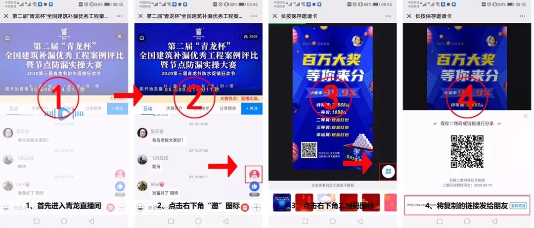 2、邀約朋友進(jìn)直播間觀看有獎:凡邀約朋友進(jìn)入青龍直播間觀看,直播榜單上的邀約人數(shù),即成為你的邀約榜單人數(shù),每邀約1人即可獲得1元獎勵(lì)。最終獎勵(lì)僅限前10名。同時(shí)為保證活動的公正性,凡后臺發(fā)現(xiàn)數(shù)據(jù)增加異常,系統(tǒng)將自動判定為惡意作弊,將取消其參加活動資格。(邀約方法:青龍直播間→右下角"邀"圖標(biāo)→右下角二維碼圖標(biāo)→將復(fù)制的鏈接發(fā)給微信朋友。朋友點(diǎn)擊后,即成為你的邀約下線。)