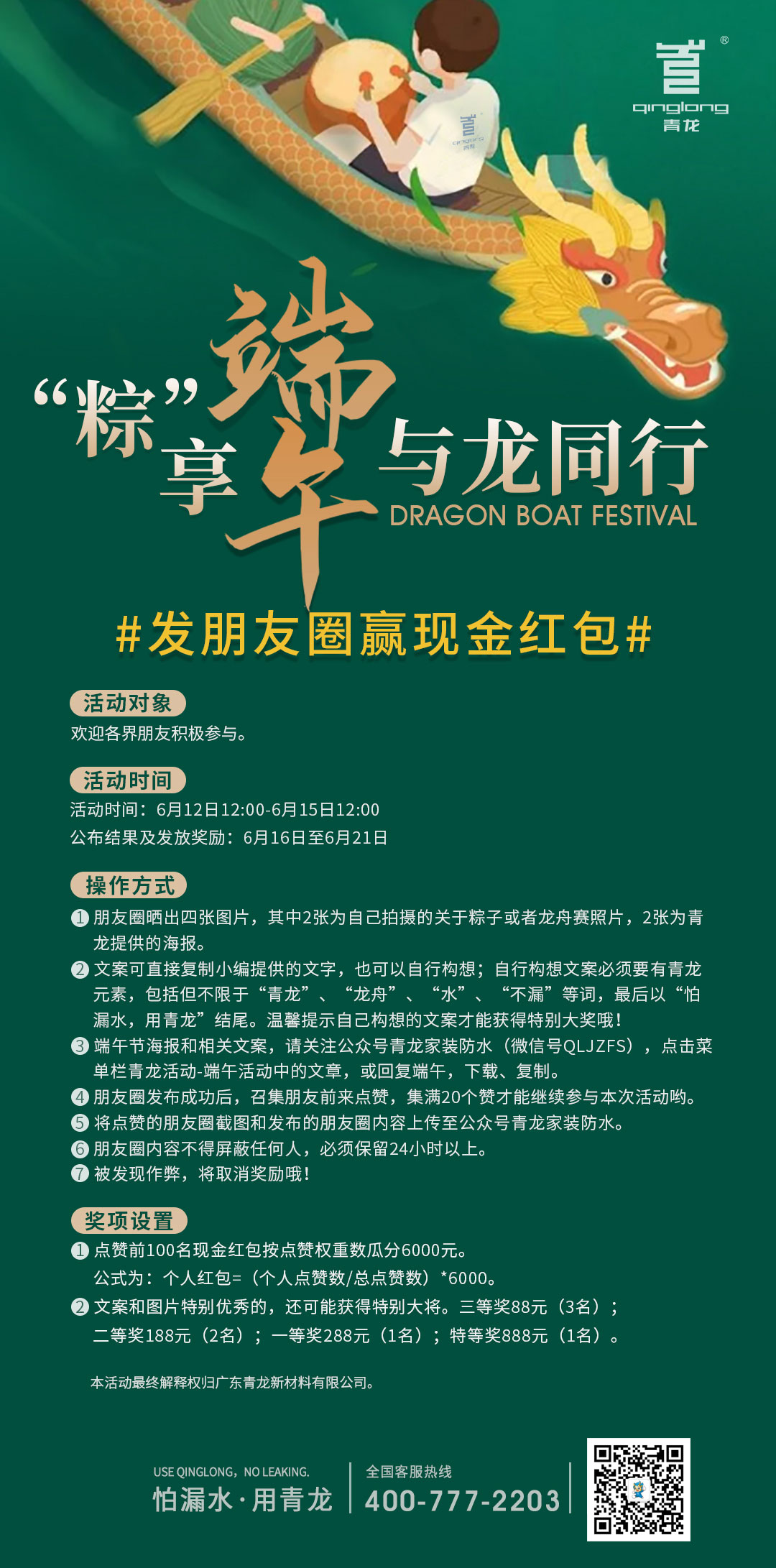 在端午節(jié)這個(gè)特殊的節(jié)日,青龍向一直關(guān)心和支持青龍事業(yè)的朋友,表示誠摯的感謝!為了增加大家快樂指數(shù),讓今年的端午節(jié)留下一份美好回記,青龍準(zhǔn)備了7800多元現(xiàn)金紅包給大家!我們誠摯邀請(qǐng)您參加我們的發(fā)朋友圈獲現(xiàn)金紅包的活動(dòng)。
