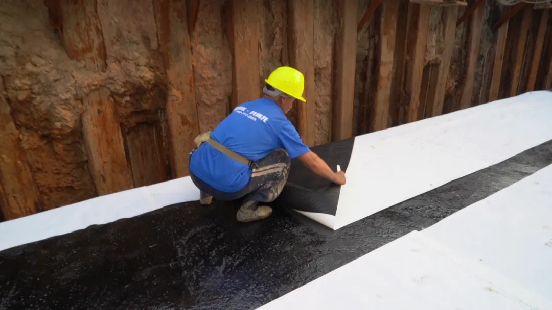 該標(biāo)段防水項(xiàng)目長度達(dá)到3km,底板防水設(shè)計(jì)的做法是青龍1.2mmHDPE高分子自粘膠膜帶沙粒,管廊的側(cè)墻和頂板所用的防水材料為1.2mmHDPE單面自粘膠膜。目前側(cè)墻的防水施工已經(jīng)全部完成,頂板的防水施工也將在工期內(nèi)很快完成。