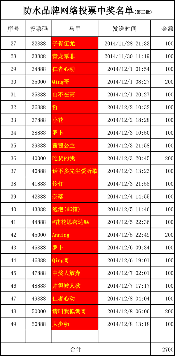 前二批獎(jiǎng)項(xiàng)已經(jīng)提前發(fā)放,請收到獎(jiǎng)金的朋友在各自朋友圈曬一曬,為青龍拉票。為了繼續(xù)感謝、鼓勵(lì)廣大朋友的鼎立支持和辛勤付出,現(xiàn)提前發(fā)放第三批獎(jiǎng)項(xiàng),恭喜中獎(jiǎng)的朋友!請獲獎(jiǎng)朋友通過青龍公眾號發(fā)送您的真實(shí)姓名、聯(lián)系方式及郵箱地址等詳細(xì)資料(我們將把獎(jiǎng)品京東E卡發(fā)送至您的郵箱,請收到后立即綁定您的京東帳號),并轉(zhuǎn)發(fā)青龍公司微博(http://weibo.com/qinglong0760)謝謝合作!