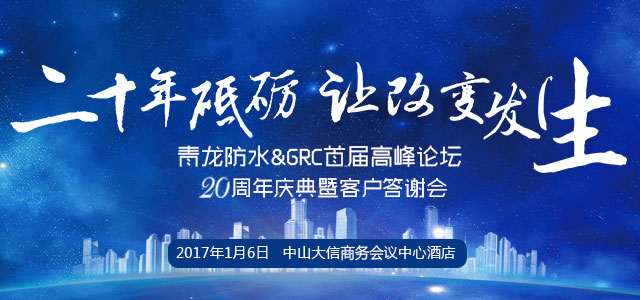 2017年1月6日,由青龍建材主辦的2017年防水&GRC高峰論壇、青龍建材20周年慶典暨客戶答謝會將于廣東中山市大信商務(wù)會議中心酒店盛大舉行,期間將邀請國內(nèi)外著名專家學者蒞臨參會,旨在齊聚防水和GRC行業(yè)各界人事,共同探討當前形勢下行業(yè)發(fā)展前景和中國建筑業(yè)的趨勢,破解行業(yè)難題。青龍建材作為東道主和主辦方,將就公司未來發(fā)展戰(zhàn)略作出重要闡述。此次行業(yè)大咖再次齊聚一堂將會碰撞出怎樣的火花,我國防水和GRC的未來究竟該如何?青龍建材誠邀行業(yè)同仁蒞臨參與拭目以待。