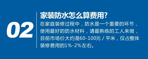 在家庭裝修過程中,防水是一個(gè)重要的環(huán)節(jié),使用最適合的防水材料,并請(qǐng)熟練的工人來做是非常重要的。目前市場(chǎng)價(jià)大約是60~100元/平米僅占整體裝修費(fèi)用的1%左右。