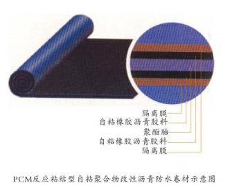 PCM反粘結型自粘聚合物改性瀝青防水卷材有兩種類型,一種是由合成橡膠和樹脂改性瀝青中加入特殊改性劑,聚酯胎為胎體,聚乙烯膜為表面材料或無膜(雙面自粘),采用硅油防粘隔離膜制成的;另一種是由PET聚酯膜(鍍鋁、鋁塑復合)、自粘橡膠瀝青料、硅油防粘隔離膜組成。