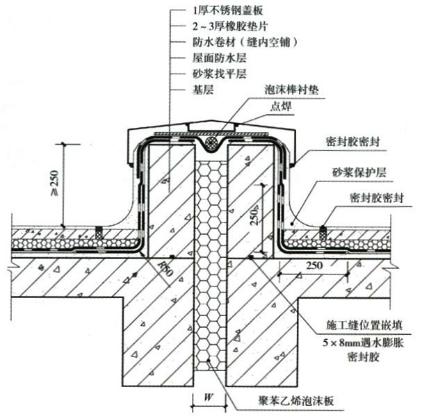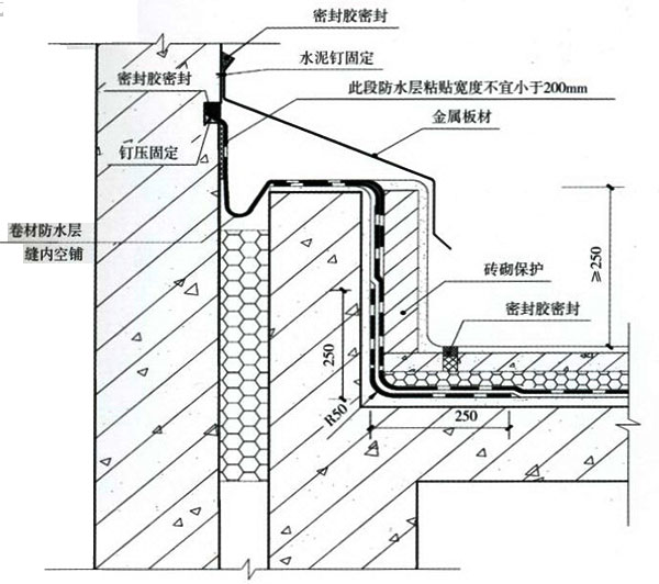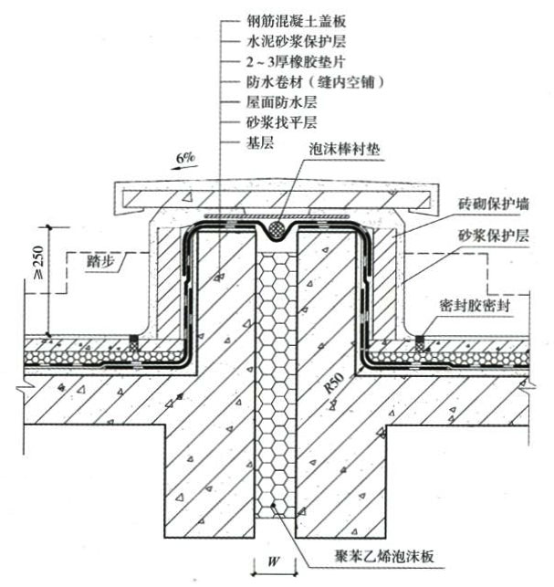 1.對變形縫的防水處理必須選用變形能力強及耐老化性能的合成高分子防水卷材,并應具備有效的密封構造措施。 2.屋面變形縫應避免設計成平縫,變形縫墻應采用≥C20混凝土澆筑,不得采用磚砌。變形縫墻體宜與屋面結構板一起澆搗,不留施工縫。如不能一次澆搗,應在墻體澆搗前施工縫位置嵌填5x8mm遇水膨脹密封膠。 3.在變形縫內填背襯材料及彈性密封材料,對等高變形縫在墻頂鋪貼一條通長“U" 形防水卷材,寬度與墻面同,先貼好一面,縫中嵌入聚乙烯泡沫塑料棒作襯墊,再粘貼另一面,上面再蓋一層高分子卷材,并與防水層相連接粘牢,形成整體防水層。然后在變形縫頂部加鋼筋混凝土蓋板或金屬蓋板,混凝土蓋板接縫用密封膠嵌填密實。 4.對高低跨變形縫,則按“U"形方式鋪設卷材,卷材上方的收頭應塞入高跨墻體預留的凹槽內,用壓條或墊片釘壓固定,凹槽上部再用金屬披水板釘壓固定。卷材收頭及金屬板均用密封材料封嚴。 5.變形縫兩側防水層應滿粘,縱向搭接寬度不小于200mm并密封嚴密。 |