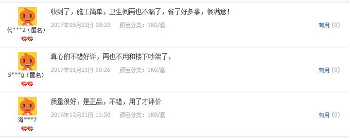 無(wú)論是線上客戶,還是線下業(yè)主,使用青龍3號(hào)的業(yè)主都一致地對(duì)青龍3號(hào)的防水性能給給予肯定和好評(píng)。其針對(duì)衛(wèi)生間滲漏的防水效果也讓其它產(chǎn)品自愧不如。