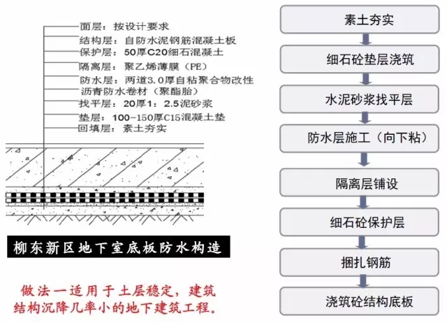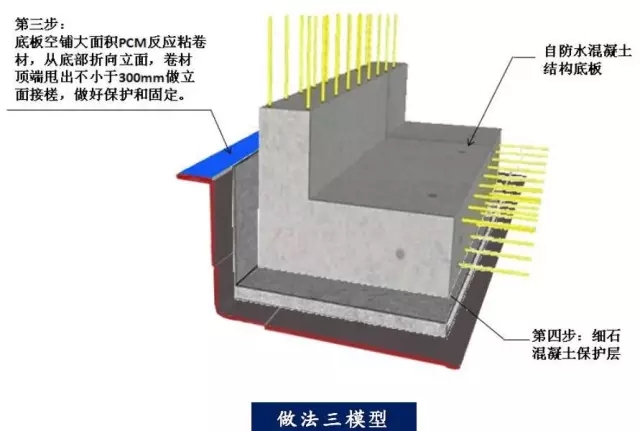 1、做法一有基礎(chǔ)沉降防水失效的風(fēng)險,做法三有保護(hù)層與后澆鋼筋砼底板形成施工縫的缺陷,不是完全意義的預(yù)鋪反粘。