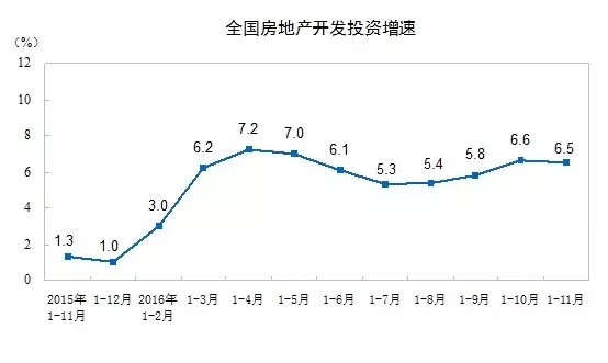 (1)2016年1-11月份,全國房地產開發(fā)投資93387億元,同比名義增長6.5%,住宅投資62588億元,增長6.0%,住宅投資占房地產開發(fā)投資的比重為67.0%。