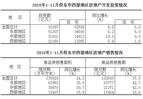 (2)1-11月份,東部地區(qū)房地產開發(fā)投資51307億元,同比增長5.2%,中部地區(qū)投資21001億元,增長10.6%;西部地區(qū)投資21080億元,增長5.8%。