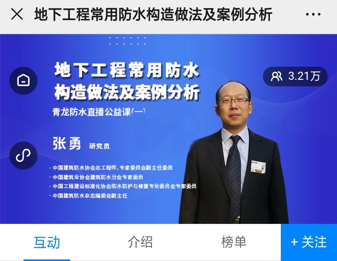 3月9日的直播將由教授級(jí)高工,中國(guó)建筑防水協(xié)會(huì)專(zhuān)家委員會(huì)專(zhuān)家委員,中國(guó)建筑學(xué)會(huì)建筑防水學(xué)術(shù)委員會(huì)副主任、專(zhuān)家委員,中國(guó)工程建設(shè)標(biāo)準(zhǔn)化協(xié)會(huì)建筑防水委員會(huì)專(zhuān)家委員,中國(guó)建筑業(yè)協(xié)會(huì)建筑防水分會(huì)副會(huì)長(zhǎng)、專(zhuān)家委員,浙江省建筑防水行業(yè)協(xié)會(huì)專(zhuān)家委員、副秘書(shū)長(zhǎng)胡駿教授主講,