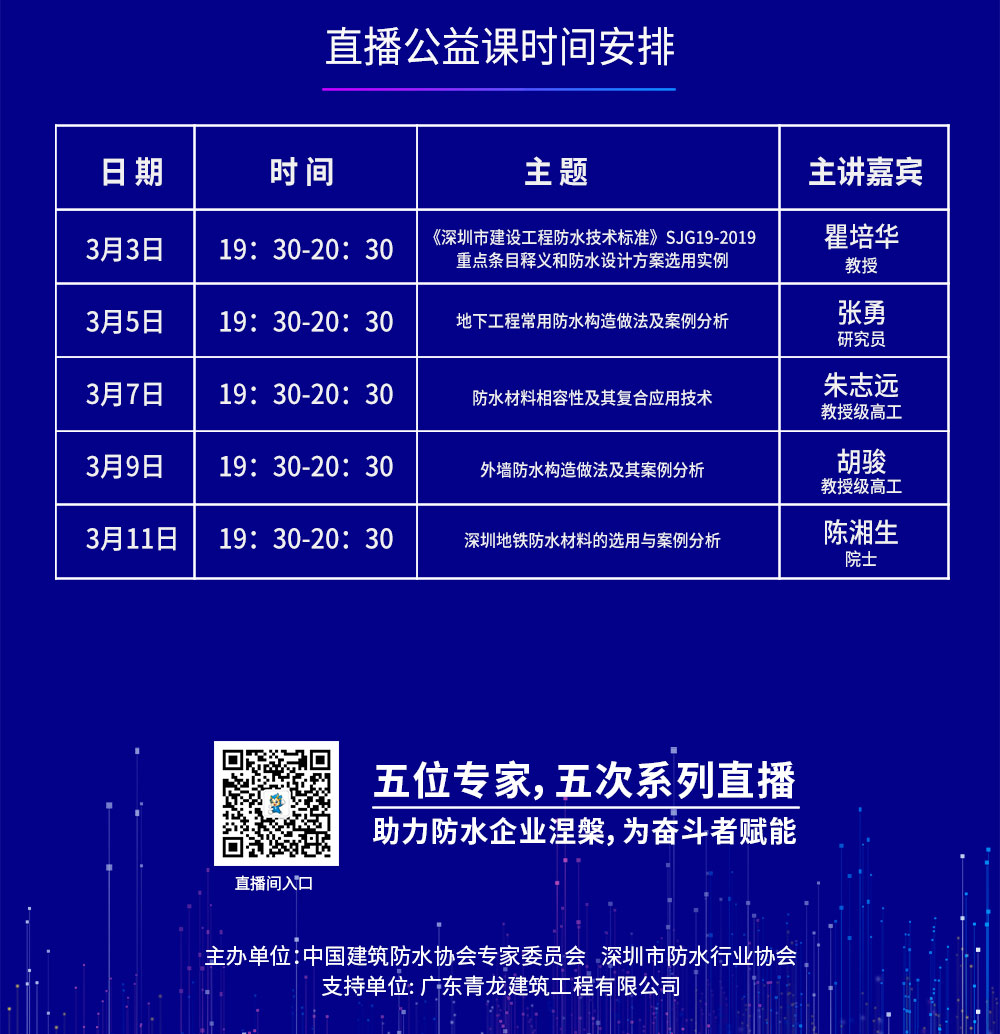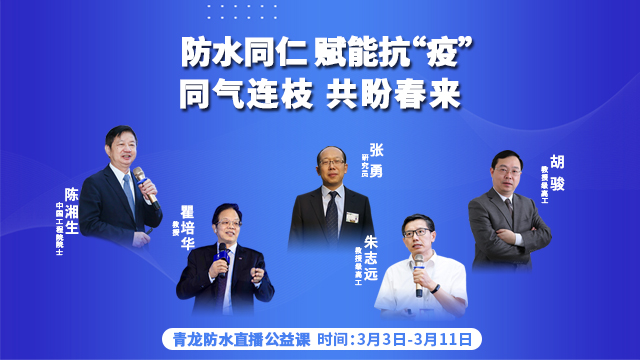 本次防水公益直播是為貫徹落實(shí)黨中央關(guān)于新冠肺炎疫情防控工作的決策部署,積極響應(yīng)各級(jí)政府的號(hào)召,由中國(guó)建筑防水協(xié)會(huì)專(zhuān)家委員會(huì)、深圳市防水行業(yè)協(xié)會(huì)主辦,廣東青龍建筑工程有限公司協(xié)辦,直播由陳湘生院士領(lǐng)銜,瞿培華教授、張勇博士、朱志遠(yuǎn)教授和胡駿教授4位專(zhuān)家支招,助力防水企業(yè)涅槃,為奮斗者賦能,讓我們防水人同氣連枝,共盼春來(lái)。